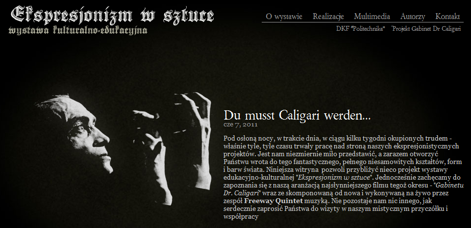 Jest nam bardzo miło poinformować wszystkich o otwarciu strony internetowej poświęconej projektowi, który powstał m.in. dzięki Dyskusyjnemu Klubowi Filmowemu „Politechnika” a mianowicie wystawy edukacyjno-kulturalnej „Ekspresjonizm w Sztuce”.