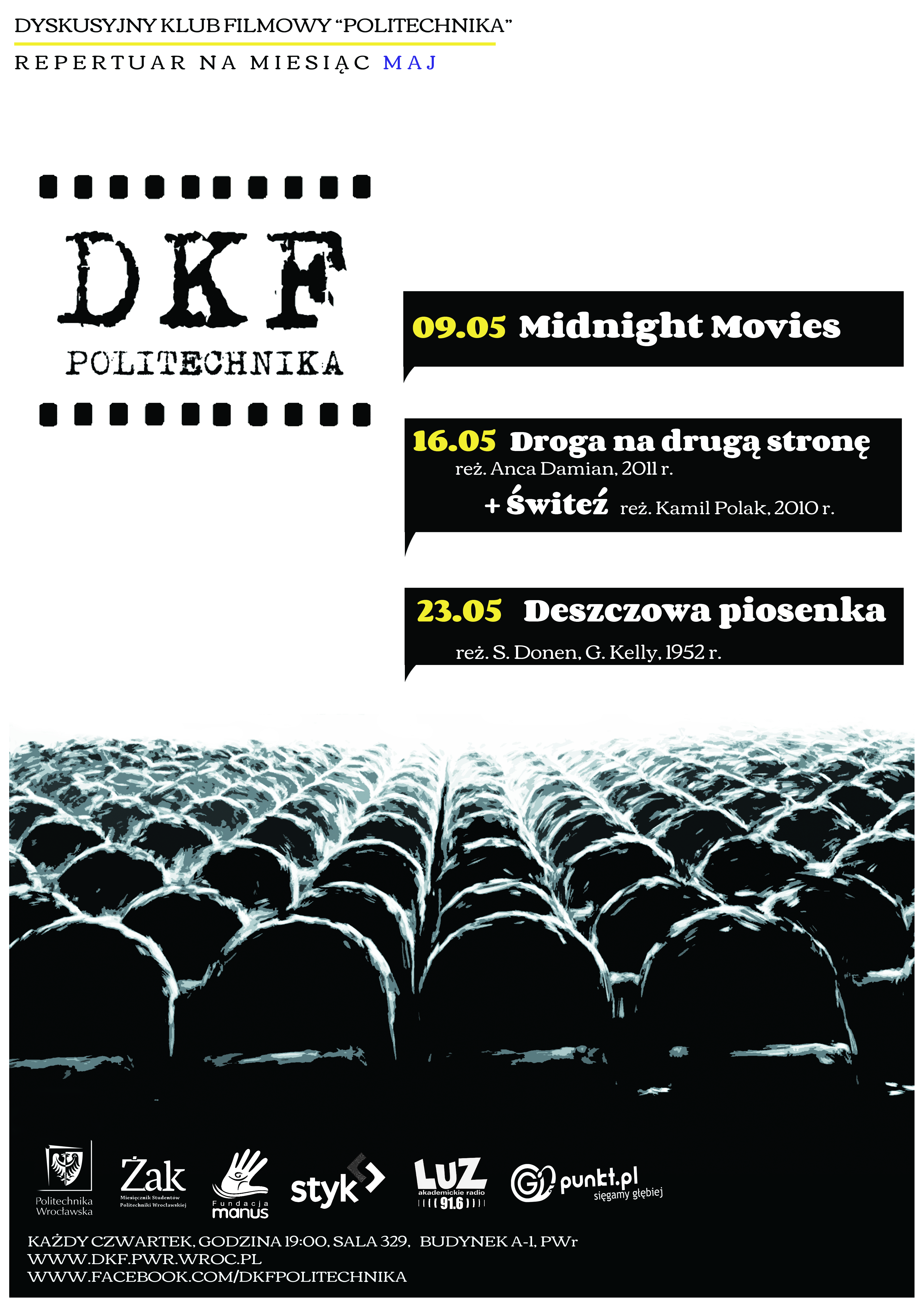 Znamy już repertuar na miesiąc maj! W czwartek 9 maja zapraszamy Was na Midnight Movies, film który każdy zainteresowany historią kina zobaczyć powinien. Następnie zapraszamy na Drogę na drugą stronę i Świteź, które odbędą się wraz ze spotkaniem z producentem obu tych filmów. Na koniec miesiąca przygotowaliśmy dla Was coś z klasyki czyli Deszczową piosenkę.