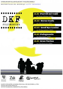 Repertuar na miesiąc luty oraz marzec już dostępny. Tym razem w lutym obejrzymy dwa filmy tj. „Pozwól mi wejść” oraz „Dersu Uzala”. Następnie mała przerwa związana z sesją i wracamy w marcu z następującymi filmami tj. „Good Bye Lenin!”, „Pożegnania” oraz „Gran Torino”. Lutowe oraz marcowe spotkania z Dyskusyjnym Klubem Filmowym „Politechnika” promuje poniższy plakat: