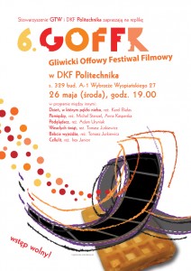 Stowarzyszenie GTW i DKF Politechnika ma przyjemność zaprosić na replikę Gliwickiego Offowego Festiwalu Filmowego 6. GOFFR 2009, który miał miejsce w listopadzie ubiegłego roku. W przeglądzie między innymi filmy nagrodzone w poprzedniej edycji festiwalu, takie jak poetycki obraz Dzień, w którym pękło niebo, reż. Karol Białas, nagroda publiczności Pomiędzy , reż. Michał Stenzel, Anna Kasperska czy krakowska produkcja The Butcher’s Films Podglądacz , reż. Adam Uryniak. Ponadto docenione już na innych festiwalach fenomenalne Wesołych świąt i Babcia wyjeżdża, reż. Tomasz Jurkiewicz i komedia Cellulit , reż. Irex Janion.