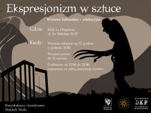 Serdecznie zapraszam na malutki wernisaż poświęcony ekspresjonizmowi w sztuce. Prezentacja wystawy będzie trwała do 12 stycznia 2011r., zaś codziennie w godzinach 21-22 będzie można oglądać ją w pełnej okazałości. Treścią ekspozycji jest nurt ekspresjonizmu w sztuce, który rozciągnął się na wszystkie jej dziedziny, w tym wypadku film, teatr, malarstwo i muzykę. Znajdziemy w niej elementy różnorodne formy prezentacji, począwszy od tradycyjnych tablic i fotografii, poprzez fragmenty materiałów filmowych, a skończywszy na multimedialnych wizualizacjach.